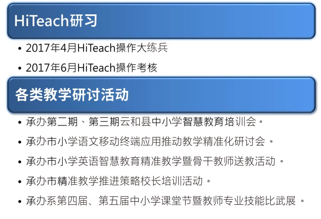 ·智慧學(xué)校發(fā)展的實(shí)踐 智慧教育的典范學(xué)校 現(xiàn)在智慧課堂已經(jīng)融入到了云和實(shí)小教師與學(xué)生們的日常生活中,為了更加熟練及落實(shí)醍摩豆智慧教育系統(tǒng),云和實(shí)小開(kāi)啟了一系列的教研培訓(xùn)、操作考核等活動(dòng),讓使每一位教師們都能落實(shí)使用HiTeach智慧教學(xué)系統(tǒng),并積極承辦省市各類教學(xué)研討活動(dòng),搭建教師們學(xué)習(xí)及交流的平臺(tái),打造云和縣智慧教育的典范學(xué)校。