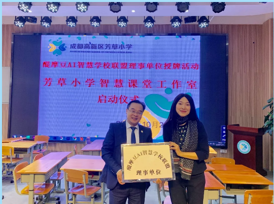 由劉彬校長(zhǎng)和梁艷副校長(zhǎng)為芳草小學(xué)授“醍摩豆AI智慧學(xué)校聯(lián)盟理事單位”匾牌。