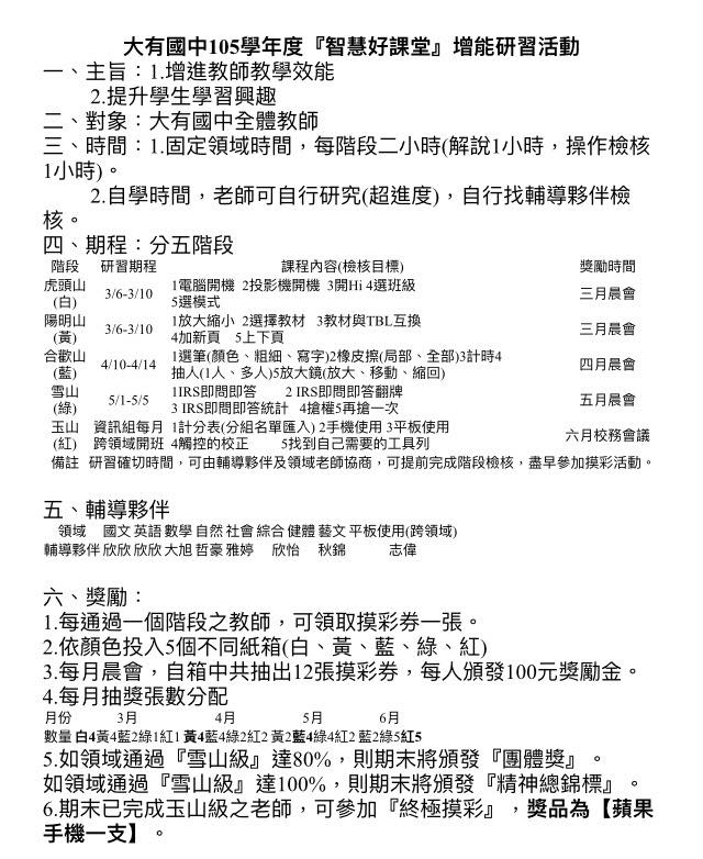 校長於巡堂時(shí)看到老師使用智慧教室,會(huì)給予桃園市政府教育局頒發(fā)的績優(yōu)狀。此外,為了激起老師們對(duì)于智慧教室的學(xué)習(xí)動(dòng)機(jī),由大有國中嫻熟智慧教室支持系統(tǒng)的七年級(jí)教師共同組成委員會(huì),擬定了“登山計(jì)劃”?!暗巧接?jì)劃”將智慧教室使用檢核目標(biāo)分為五階段,如同破關(guān)卡游戲一樣以臺(tái)灣五座山的高度設(shè)置難度,每位老師需向委員會(huì)提出登山申請(qǐng),再經(jīng)由委員會(huì)觀看老師實(shí)際操作的情況來決定審核是否通過。通過一座山的認(rèn)證,就能夠取得一張摸彩卷在每月中參加摸彩。而通過玉山級(jí)(最高)的認(rèn)證更能夠於學(xué)期末摸大獎(jiǎng),獎(jiǎng)項(xiàng)是iPhone7跟平板電腦!另外,只要各領(lǐng)域的所有教師都通過雪山級(jí)的專家委員認(rèn)證,該領(lǐng)域所有教師人人都可以獲得一張飯店下午茶券,并得到”精神總錦鏢”。互相激勵(lì),互相學(xué)習(xí),讓老師們借由“登山計(jì)劃”熟悉使用智慧教室,并且給予獎(jiǎng)勵(lì),在大有,教師專業(yè)成長好幸福!