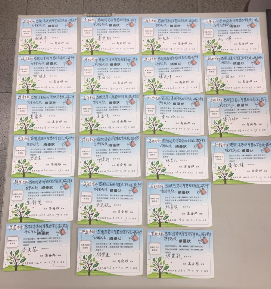 校長於巡堂時(shí)看到老師使用智慧教室,將給予桃園市政府教育局頒發(fā)的績優(yōu)狀此外,為了培養(yǎng)更多優(yōu)秀的智慧教師,陳家祥校長提出科技領(lǐng)導(dǎo)理念5原則,加速智慧教師精進(jìn)教學(xué),專業(yè)成長。