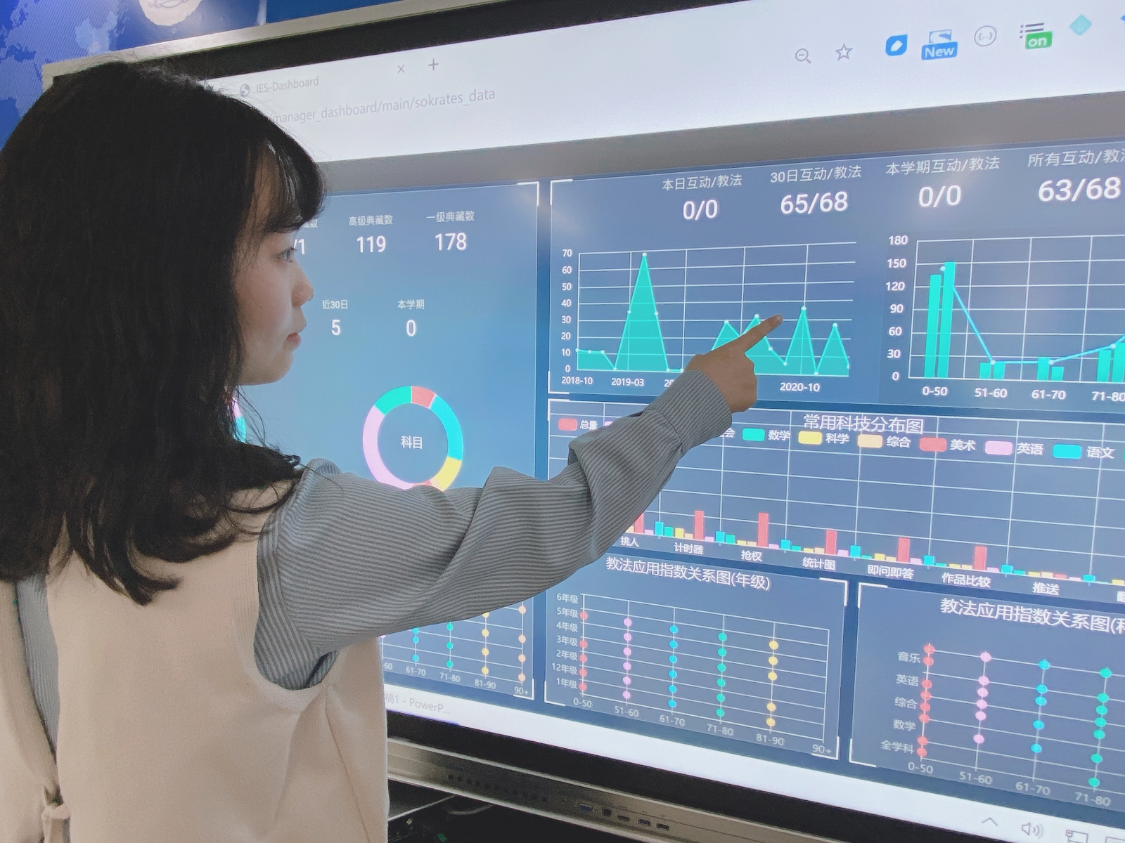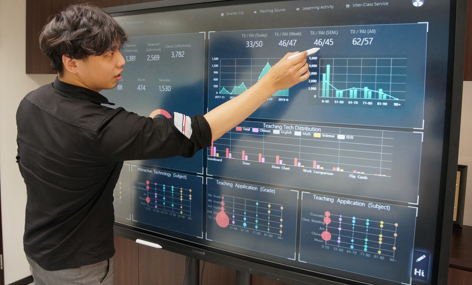 而教與學大數(shù)據(jù)管理服務之儀表板,則讓學校團隊能一覽全校教師的科技使用情況,并根據(jù)時間、學年、學科...等向度各別呈現(xiàn)圖表,作為教學研究團隊規(guī)劃教師專業(yè)成長計劃的重要參考依據(jù)。