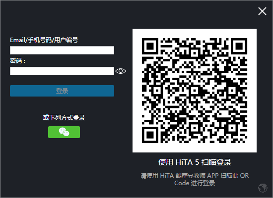 圖示,可執(zhí)行HiTeach助手。預(yù)設(shè)會(huì)彈出登入視窗,請(qǐng)使用HiTA app掃碼或賬號(hào)登入(用戶編號(hào)/google/facebook/wechat),登入后即可使用。