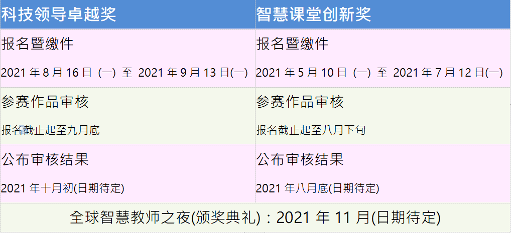 「科技領(lǐng)導(dǎo)卓越獎與智慧課堂創(chuàng)新獎」每年來自世界各地的智慧教師及學(xué)校校長人數(shù)多達百人以上,并于一年一度的智慧教育盛會,「全球科技領(lǐng)導(dǎo)與教學(xué)科技高峰論壇」之「全球智慧教師之夜」進行頒獎典禮,將給予得獎?wù)咦罡呖隙ㄅc表揚,是為教學(xué)科技相關(guān)盛大活動之一。