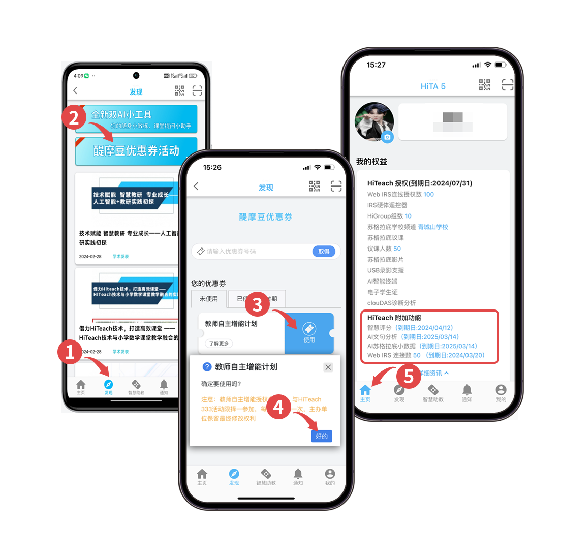 步驟三、在手機(jī)HiTA 5上申請(qǐng)教師自主增能計(jì)劃 到發(fā)現(xiàn)頁(yè)面點(diǎn)選醍摩豆優(yōu)惠卷活動(dòng),點(diǎn)選兌換鈕,因計(jì)劃一、計(jì)劃二僅能擇一參加,若您確定參加的是計(jì)劃一,則從提示畫(huà)面中點(diǎn)選兌換鈕,即可完成兌換。兌換成功后,到主頁(yè)的我的權(quán)益,點(diǎn)開(kāi)詳細(xì)信息,即可看到您的個(gè)人權(quán)益已經(jīng)獲得HiTeach專(zhuān)業(yè)版50人連線授權(quán) 3個(gè)月。