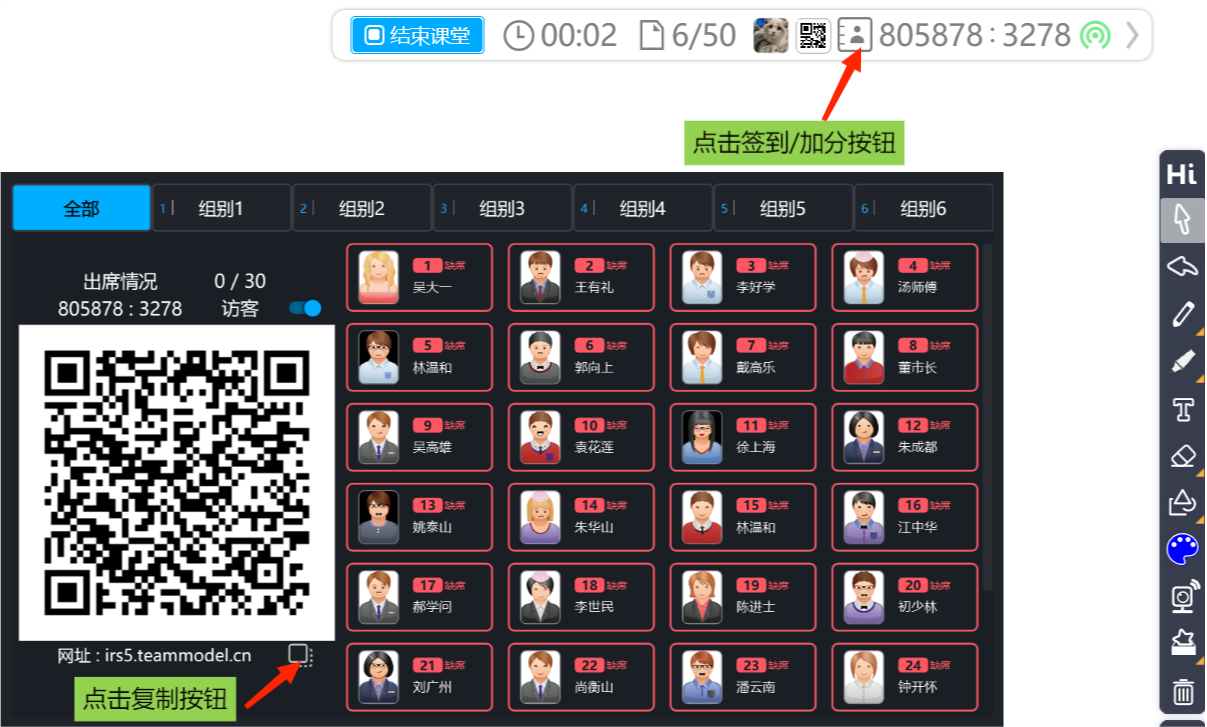 在開(kāi)始課堂之后,正式上課前,可以先點(diǎn)選HiTeach的簽到/加分按鈕,接著點(diǎn)選復(fù)制鈕,復(fù)制本次課堂的超連結(jié)后,以通訊軟件或其他機(jī)制將超連結(jié)貼給學(xué)生們,直接用此連結(jié)連線,斷線也可以重新連。