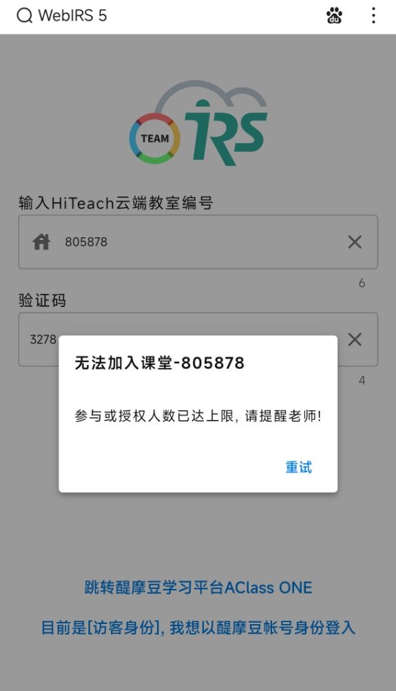 使用HiTeach5與學(xué)生互動(dòng)的時(shí)候,學(xué)生端WebIRS連線出現(xiàn)「參與或授權(quán)人數(shù)已達(dá)上限」,而無(wú)法加入課堂參與互動(dòng),通常是HiTeach的學(xué)生連線授權(quán)授權(quán)數(shù)已達(dá)上限,請(qǐng)利用HiTeach助手上的授權(quán)信息來(lái)檢視授權(quán)數(shù)量是否足夠。若是HiTeach928公益授權(quán),則預(yù)設(shè)只有2位學(xué)生可連線使用。