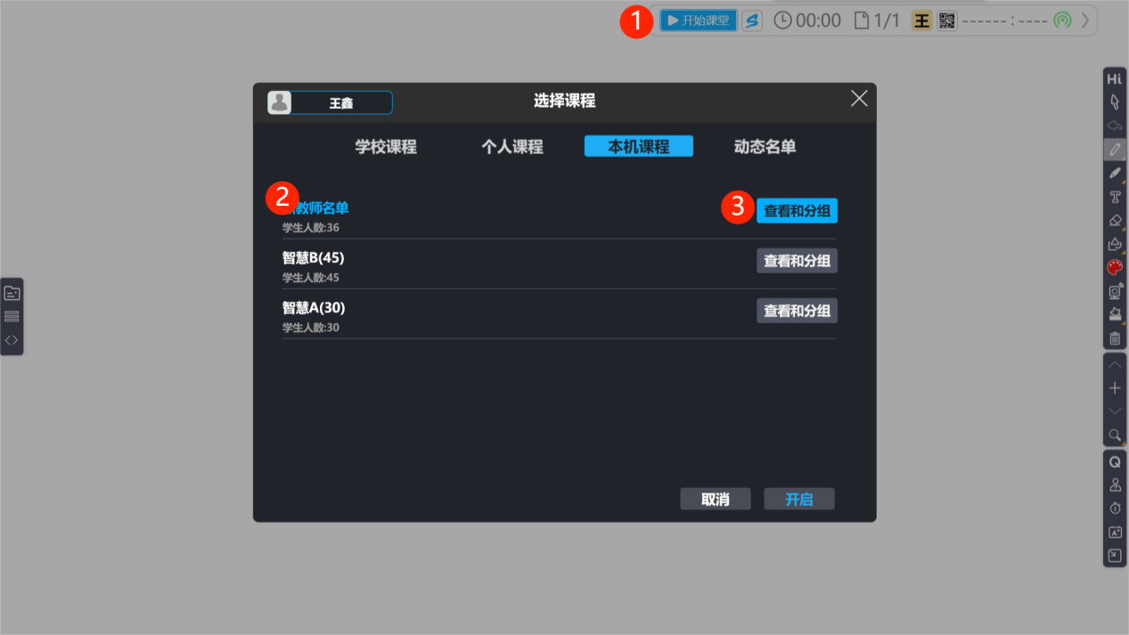 步驟1.請您進(jìn)入 HiTeach 5 操作界面后,選擇 “開始課堂”,并找到您欲進(jìn)行分組的課程名單后,點(diǎn)擊右側(cè) “查看與分組”。
