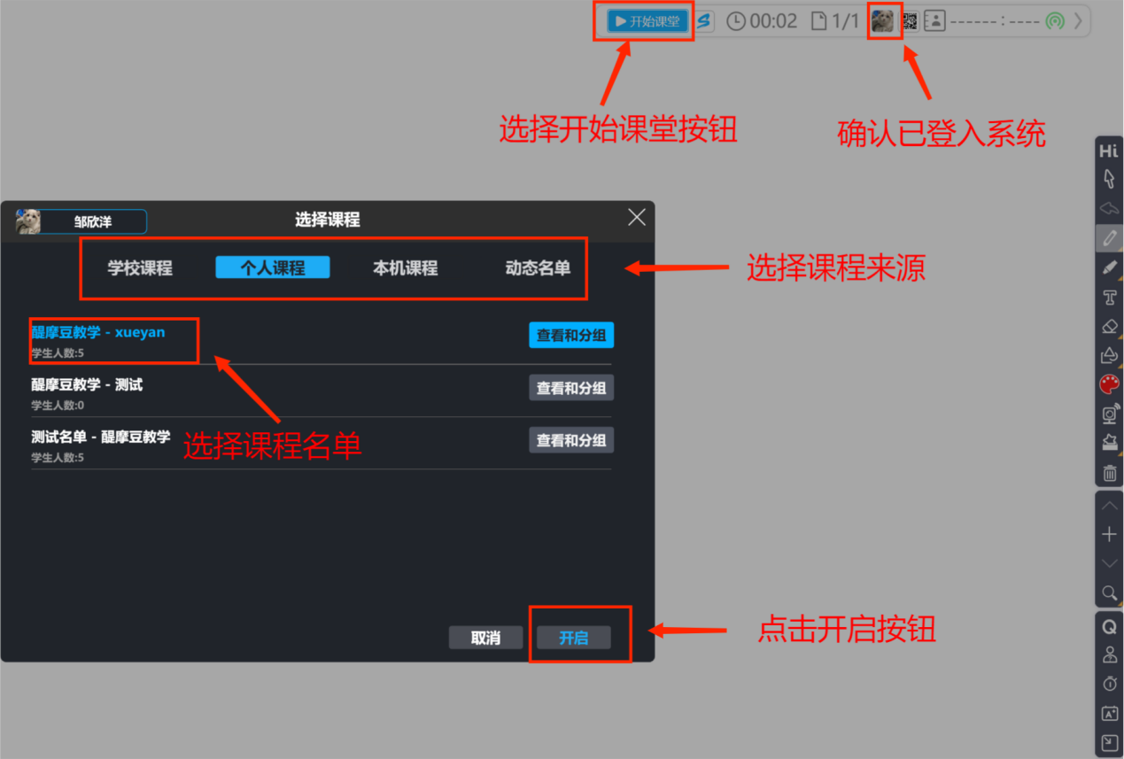 步驟1:在HiTeach登入自己的醍摩豆賬號(hào)之后,點(diǎn)選開始課堂鈕,出現(xiàn)選擇課程視窗后,選擇這堂課的課程資料來源,再選擇課程名單,最后點(diǎn)選開啟鈕。