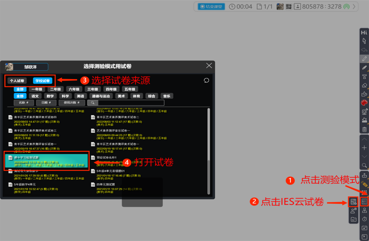 步驟2:選擇測(cè)驗(yàn)?zāi)J?/span>鈕,再選擇IES云試卷鈕,接著在學(xué)校試卷中選擇一份試卷