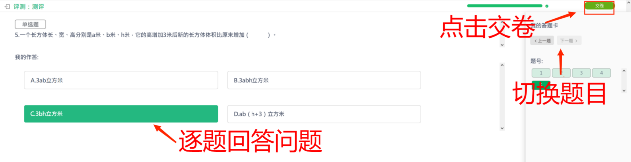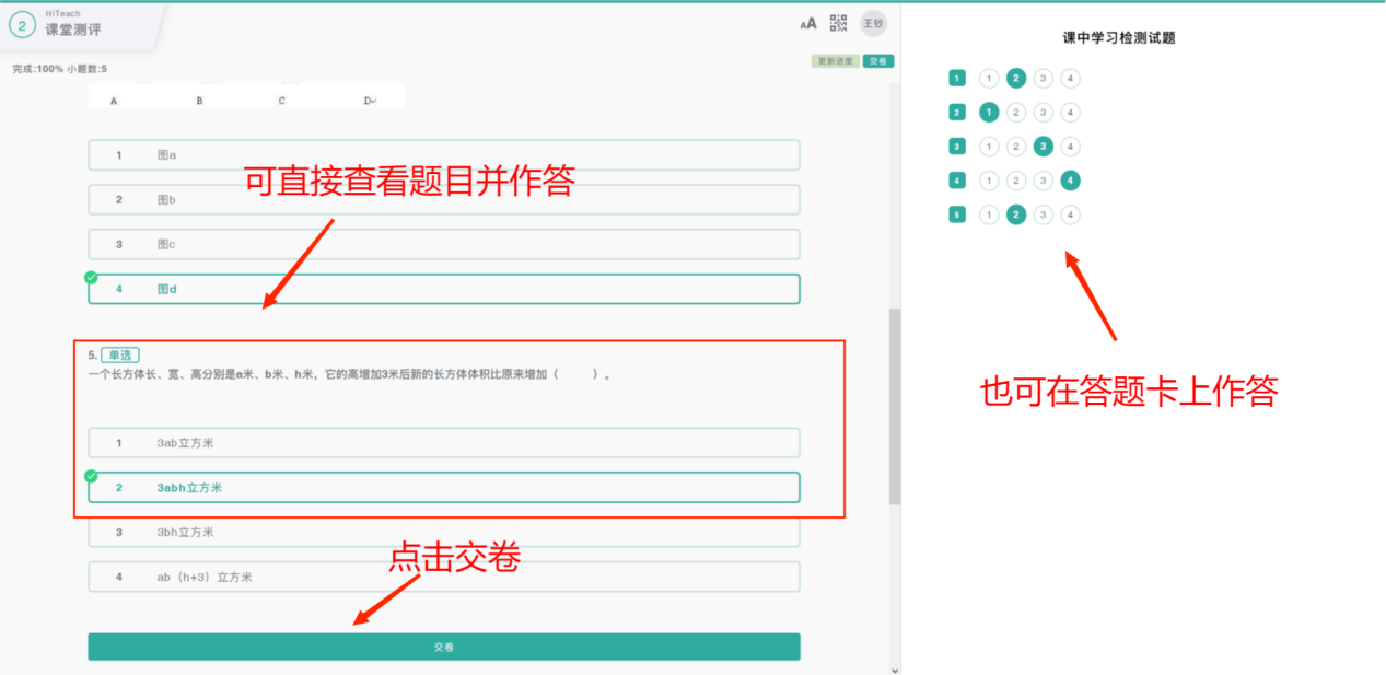 步驟3:進(jìn)入作答畫面后,可逐題回答問題或選擇題號(hào)作答,問答題可以拍照或選擇本機(jī)圖片檔案,完成作答后,選擇交卷鈕。