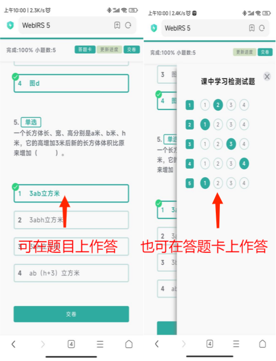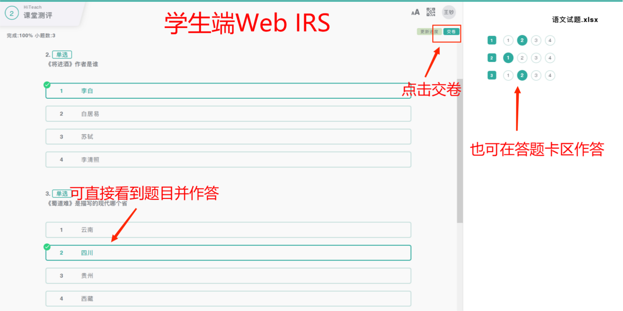學(xué)生端Web IRS就可以使用平板計(jì)算機(jī)、一般計(jì)算機(jī)瀏覽器或手機(jī)連線開始作答。作答時(shí),可以逐題檢視,然后選擇自己的答案,答題卡區(qū)則可以查看已經(jīng)作答的情況,甚至直接在答題卡區(qū)選擇答案。確定整份試卷作答完成后,點(diǎn)選交卷鈕。