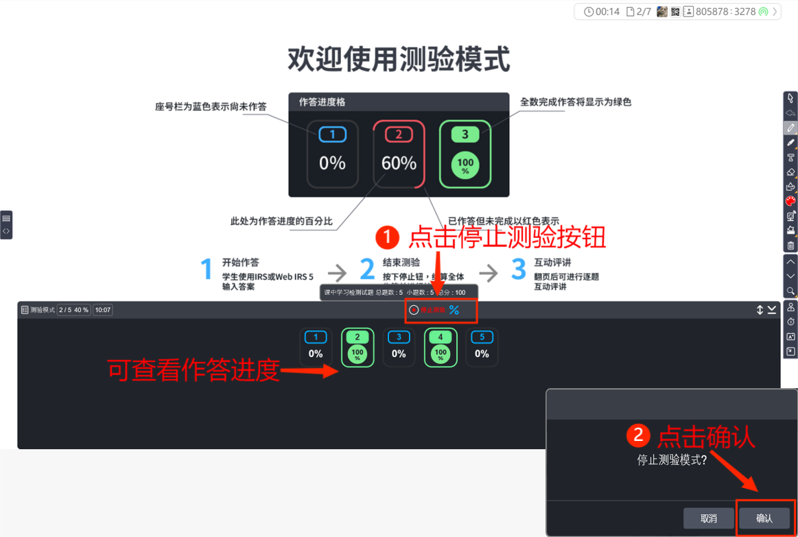 學(xué)生作答的過程中,教師端HiTeach可以檢視所有學(xué)生作答的進(jìn)度,等待學(xué)生端完成作答后,按下停止測(cè)驗(yàn)鈕,再點(diǎn)選確認(rèn)鈕,會(huì)顯示評(píng)量結(jié)果數(shù)據(jù)。