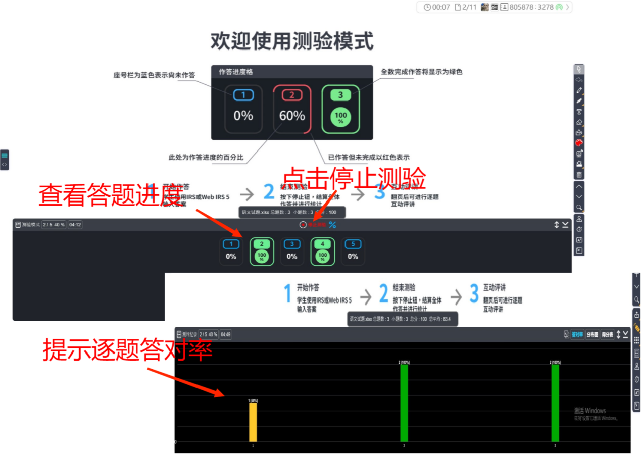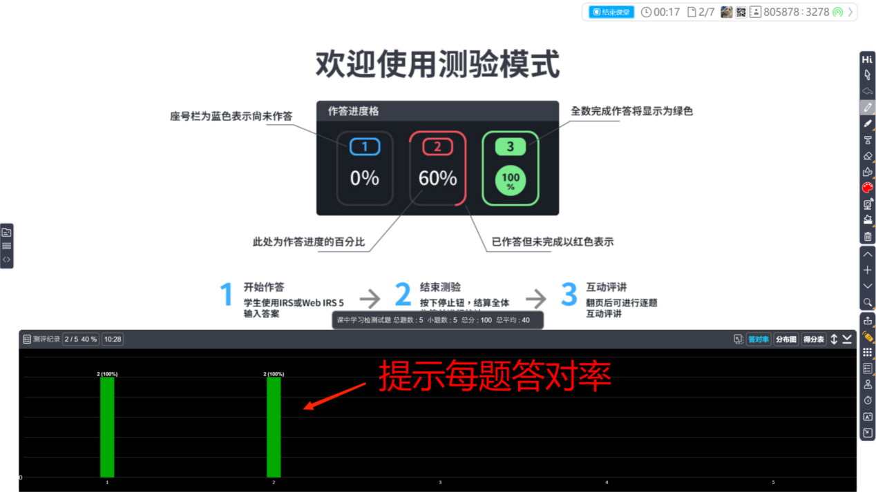 學(xué)生作答的過程中,教師端HiTeach可以檢視所有學(xué)生作答的進(jìn)度,等待學(xué)生端完成作答后,按下停止測(cè)驗(yàn)鈕,再點(diǎn)選確認(rèn)鈕,會(huì)立即顯示逐題答對(duì)率,可做為挑選重點(diǎn)題目來講解說明的參考,根據(jù)數(shù)據(jù)可優(yōu)先挑選紅色答對(duì)率的題目來進(jìn)行互動(dòng)評(píng)講。
