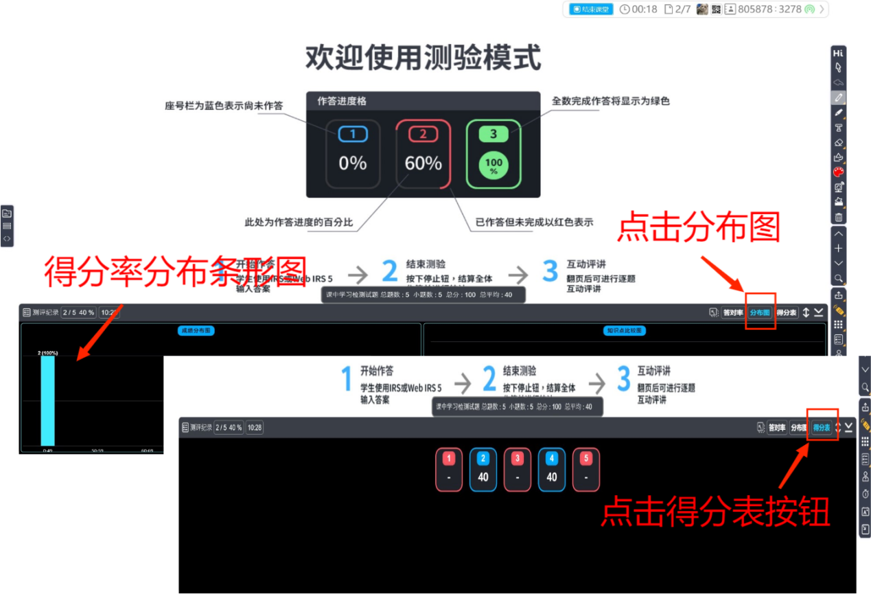 此外,點(diǎn)選分布圖鈕,會(huì)顯示得分率分布長(zhǎng)條圖,以及知識(shí)點(diǎn)分布圖;點(diǎn)選得分表鈕,則會(huì)顯示所有學(xué)生測(cè)驗(yàn)結(jié)果的得分情況。