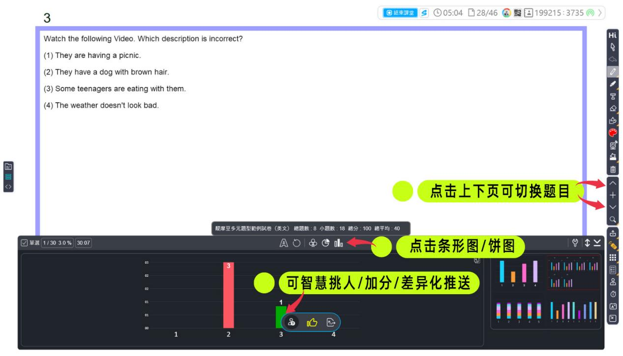 教師可利用HiTeach工具列的上一頁/下一頁鈕,檢視各題題目的答題結(jié)果,每道題目的答題結(jié)果可使用長(zhǎng)條圖、圓餅圖、翻牌等功能,因?yàn)橐呀?jīng)有了答題數(shù)據(jù),所以可以據(jù)此進(jìn)行智慧挑人,差異化推送等互動(dòng)評(píng)講,將問題理解加深、加廣。