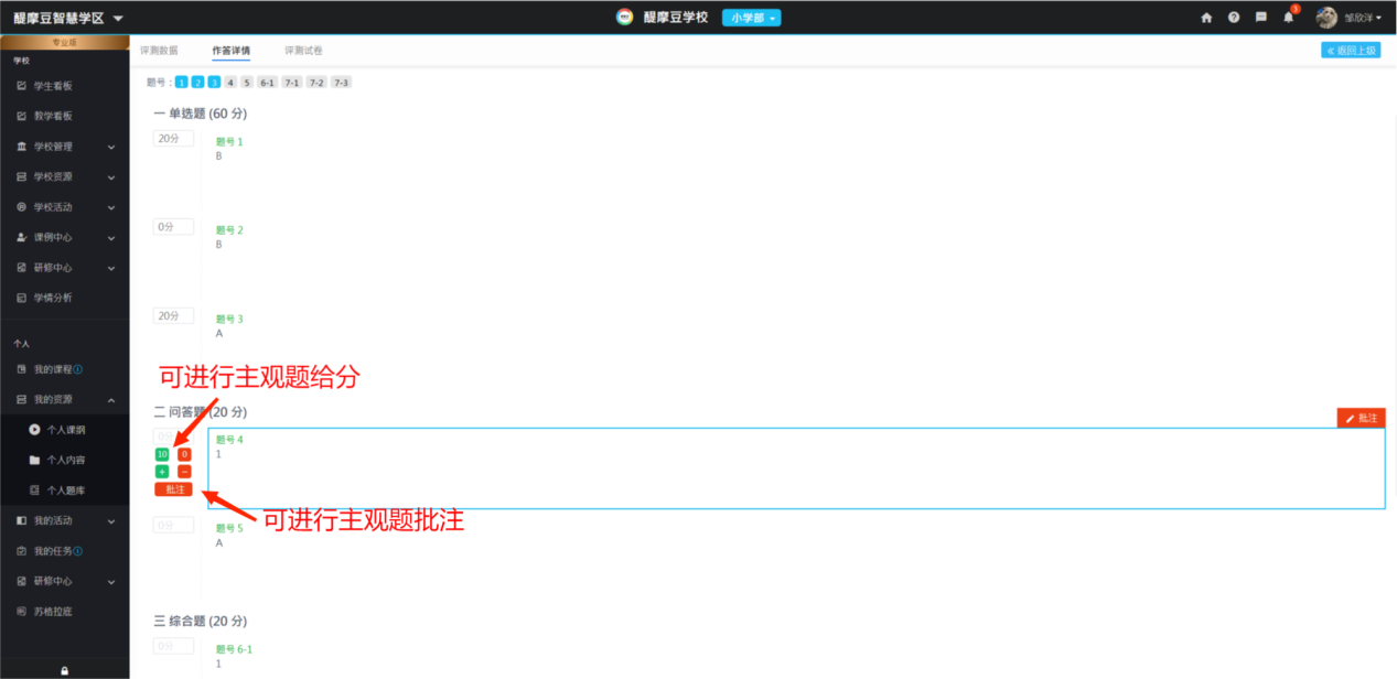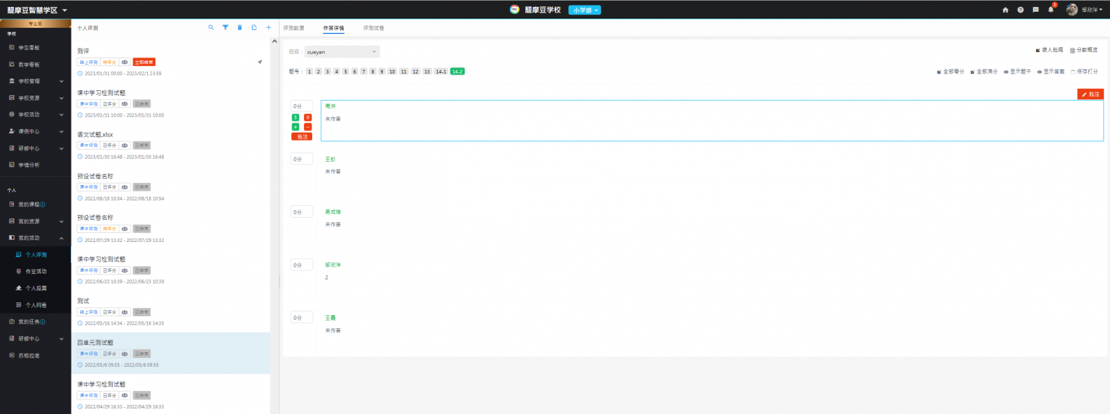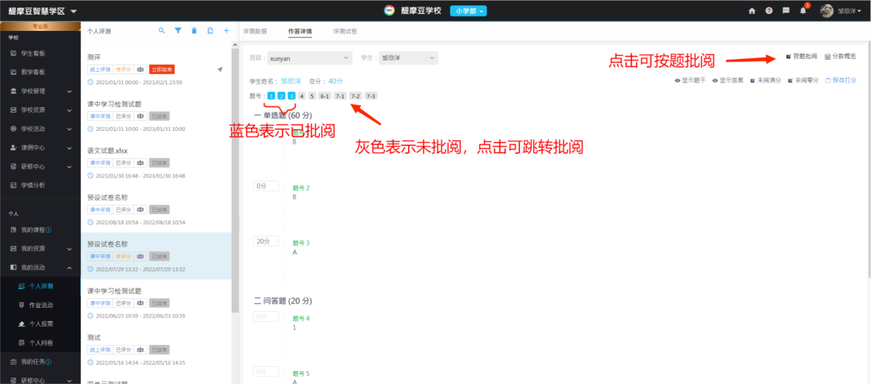 評(píng)量試卷中,單選題、多選題和是非題等客觀題型,系統(tǒng)會(huì)自動(dòng)批閱。主觀題型由教師自行批閱。下面是教師批閱評(píng)量試卷的操作流程頁面:
