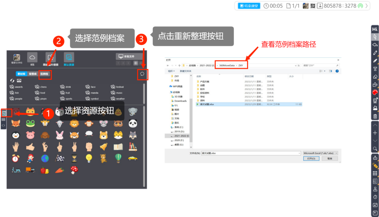 取得的Excel試題,首先要確認(rèn)是否符合HiTeach所支援的欄位安排,可從HiTeach取得參考的范例檔案。請(qǐng)從HiTeach教材資源區(qū)點(diǎn)選資源鈕,若您是新安裝,請(qǐng)點(diǎn)選重新整理鈕,以取得云端所提供的最新資源,然后點(diǎn)選范例檔標(biāo)簽,即可查閱范例檔存放路徑,以及可參考的Excel試卷范例檔。