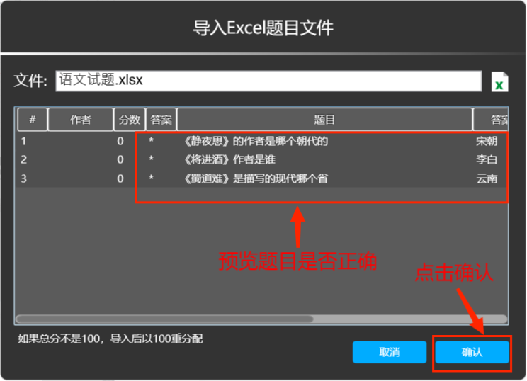 步驟2:出現(xiàn)試卷預(yù)覽畫面后,檢視試卷題目是否正確,若確認(rèn)無誤,則點(diǎn)選確認(rèn)鈕。