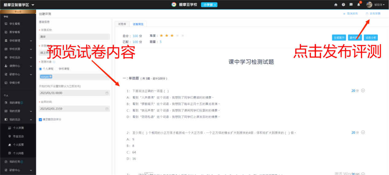 發(fā)布在線自主評(píng)量活動(dòng),需要先準(zhǔn)備好云端試卷,請(qǐng)參考本文前面IES云試卷測(cè)驗(yàn)部分的介紹說明。下面說明發(fā)布在線自主評(píng)量的操作流程步驟: