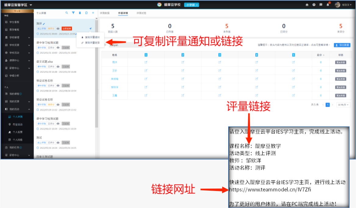 發(fā)布評(píng)量活動(dòng)之后,在移動(dòng)鼠標(biāo)指標(biāo)到該評(píng)量活動(dòng)項(xiàng)目區(qū)的訊息鈕處,會(huì)出現(xiàn)選單,可復(fù)制包含評(píng)量活動(dòng)名稱、相關(guān)信息以及超連結(jié)的訊息,直接貼到班級(jí)實(shí)時(shí)通訊群組給學(xué)生,或者只復(fù)制單純的活動(dòng)超連結(jié)信息給學(xué)生,讓學(xué)生可點(diǎn)擊超連結(jié),就立即前往進(jìn)行評(píng)量活動(dòng)。