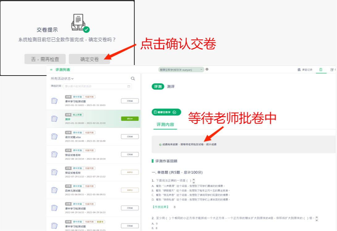 步驟4:出現(xiàn)確定交卷頁面后,選擇確定交卷鈕。 回活動(dòng)畫面后,若活動(dòng)時(shí)間尚未截止,會(huì)顯示成績(jī)尚未結(jié)算,請(qǐng)等待老師批改試卷狀態(tài)。