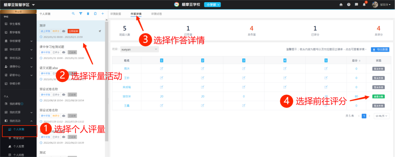 步驟1:教師登入云平臺(tái)IES,選擇我的活動(dòng)/個(gè)人評(píng)量,接著選擇要進(jìn)行批閱的評(píng)量活動(dòng),然后選擇作答詳情標(biāo)簽,再針對(duì)開始批閱的學(xué)生選擇前往評(píng)分鈕。