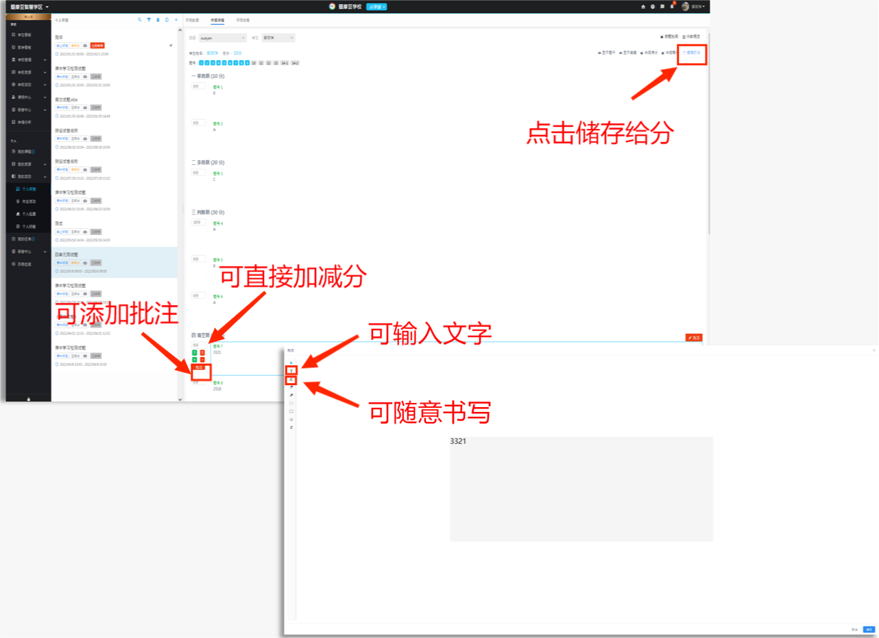 步驟3:主觀題批閱時(shí),可以直接加減分來操作給分,點(diǎn)選批注鈕,則可針對(duì)作答結(jié)果進(jìn)一步以畫筆、輸入文字等方式進(jìn)行批注,批注完成則點(diǎn)選確定鈕。完成一項(xiàng)給分后,選擇儲(chǔ)存給分鈕。