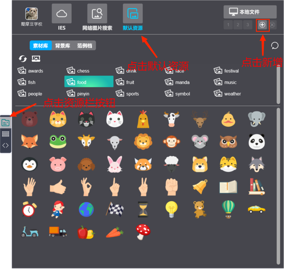 首先點(diǎn)選HiTeach的資源鈕,在預(yù)設(shè)資源的畫面中,點(diǎn)選新增鈕。