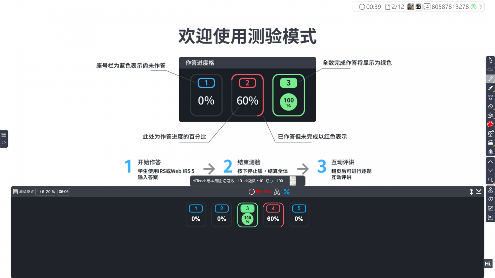學生答完試卷后或開始測驗的過程中,老師就可以啟動HiTeach的隨堂紙本測驗模式。在隨堂紙本測驗視窗中,設定試卷題型與題數(shù)、選項數(shù),例如單選題X5、復選題X3和填充題X2,如果有準備這份試卷的圖片,或者臨時拍照的試卷圖,可以做為附件(學生端Web IRS就會看到試卷圖片、測驗結(jié)束評講時也可作為講解說明),接著設定答案時,可以選擇隱藏鈕,避免學生看見正確答案,完成設定后,在HiTeach的畫面上會顯示每一個學生的答題進度。