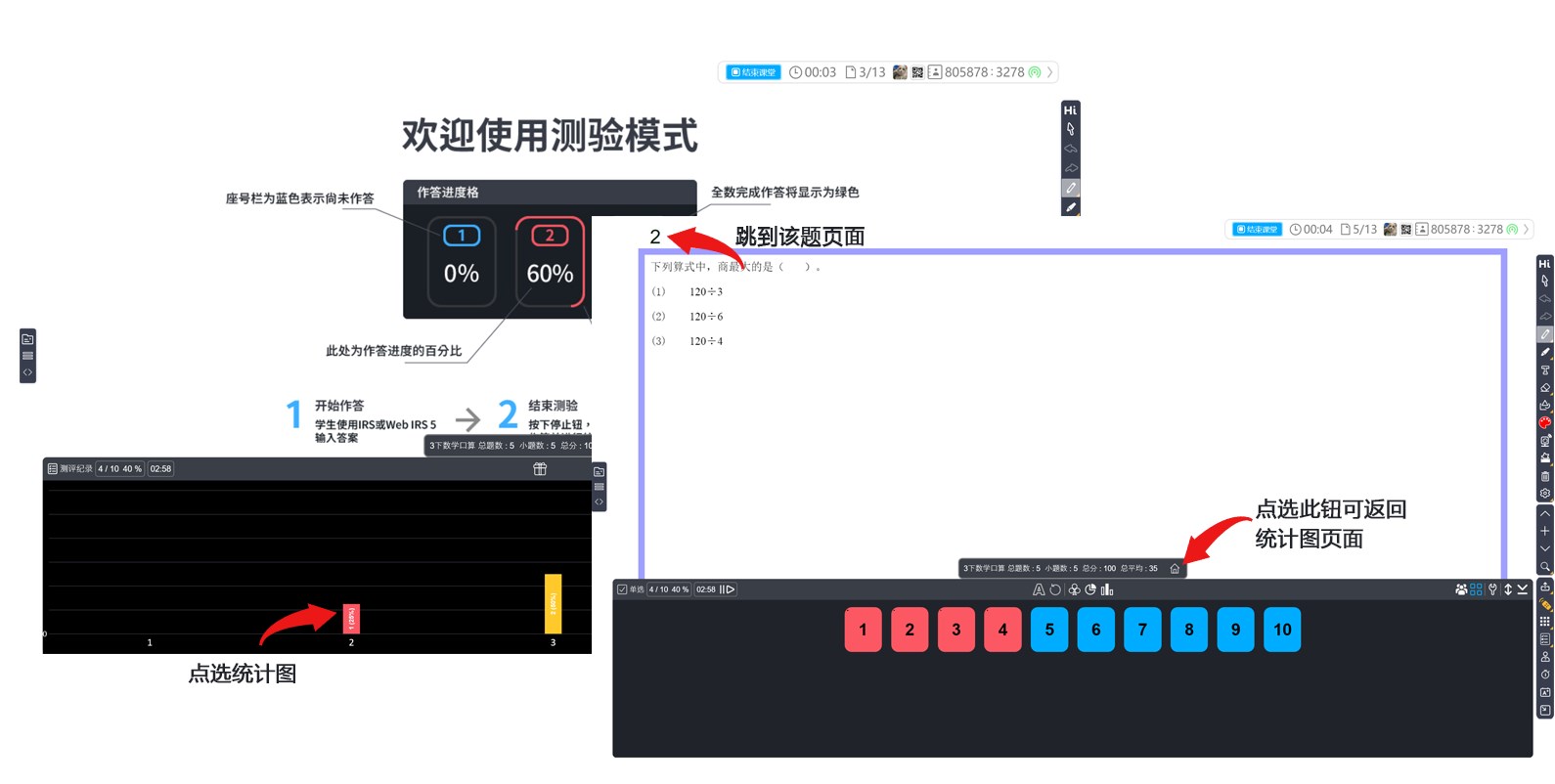 測(cè)驗(yàn)?zāi)J绞窃S多老師課堂評(píng)量愛用的功能,現(xiàn)在更好用了。測(cè)驗(yàn)結(jié)束后,查看測(cè)驗(yàn)圖表,點(diǎn)選逐題答對(duì)率長(zhǎng)條圖/題號(hào),就會(huì)跳到該評(píng)講頁,該頁評(píng)講結(jié)束也可以跳回到統(tǒng)計(jì)圖表標(biāo)題頁。