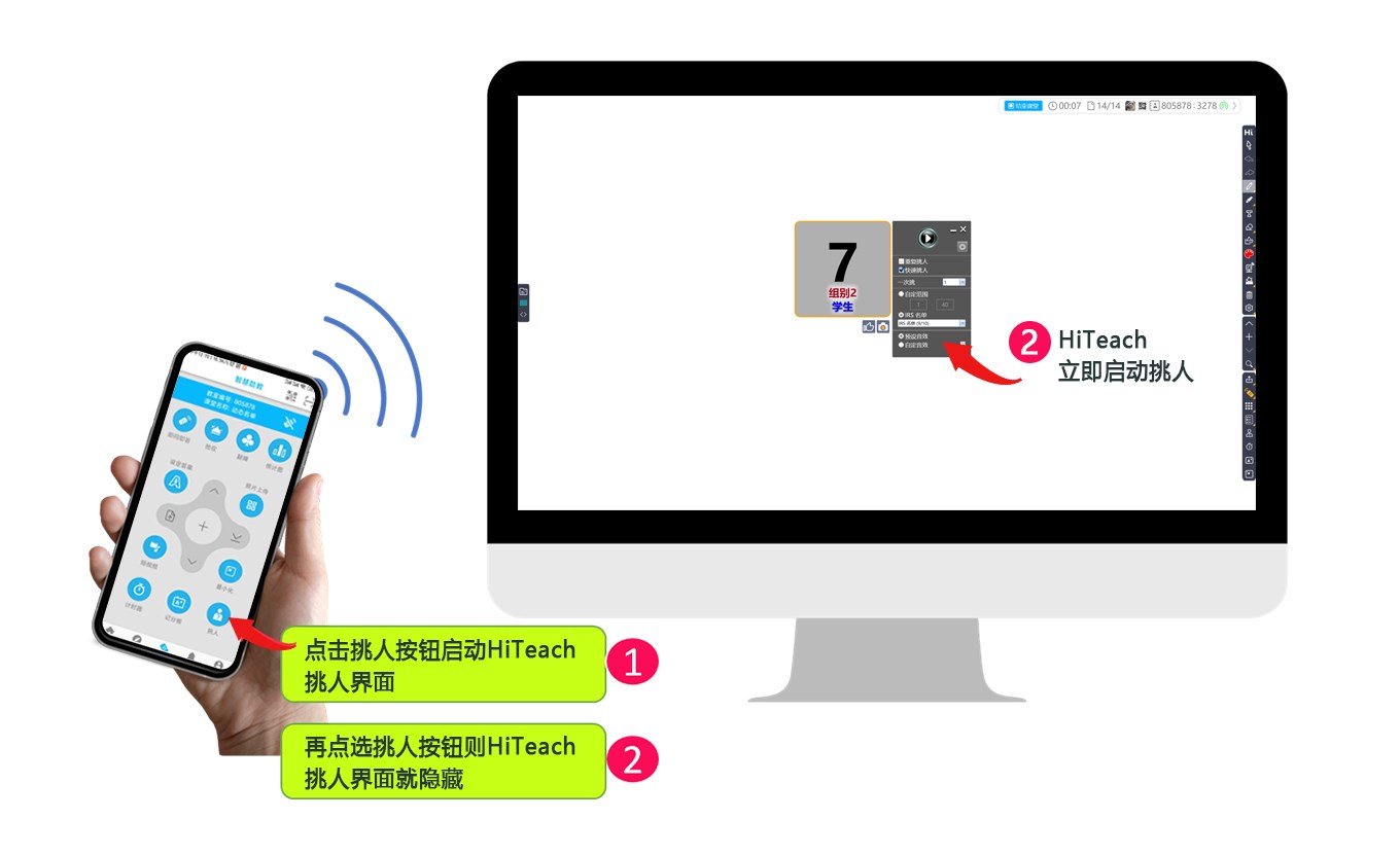 ?HiTA app遙控挑人時(shí),可以一鍵即挑,再一鍵即收。也就是說,點(diǎn)選一下挑人鈕,HiTeach端可立即顯示挑人界面,并且執(zhí)行挑人,若再點(diǎn)選一下挑人鈕,則HiTeach端的挑人界面就隱藏,避免遮擋頁面內(nèi)容,當(dāng)老師在教室里移動(dòng)教學(xué)時(shí),特別方便!