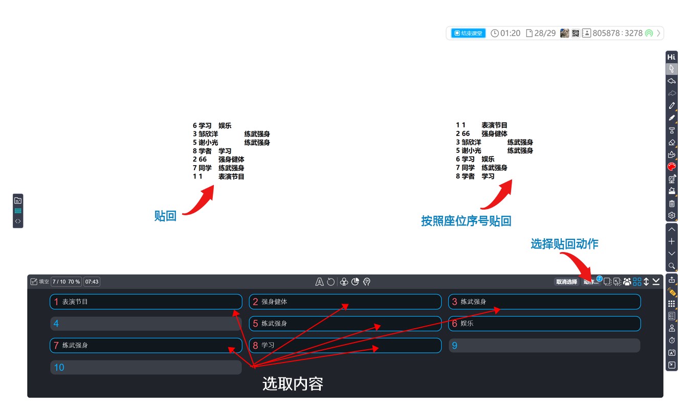 若要搭配填充題使用,于填充題結(jié)束翻牌后,同樣點(diǎn)擊HiTeach工具列的同步互動(dòng)按鈕,即可使用上述功能。