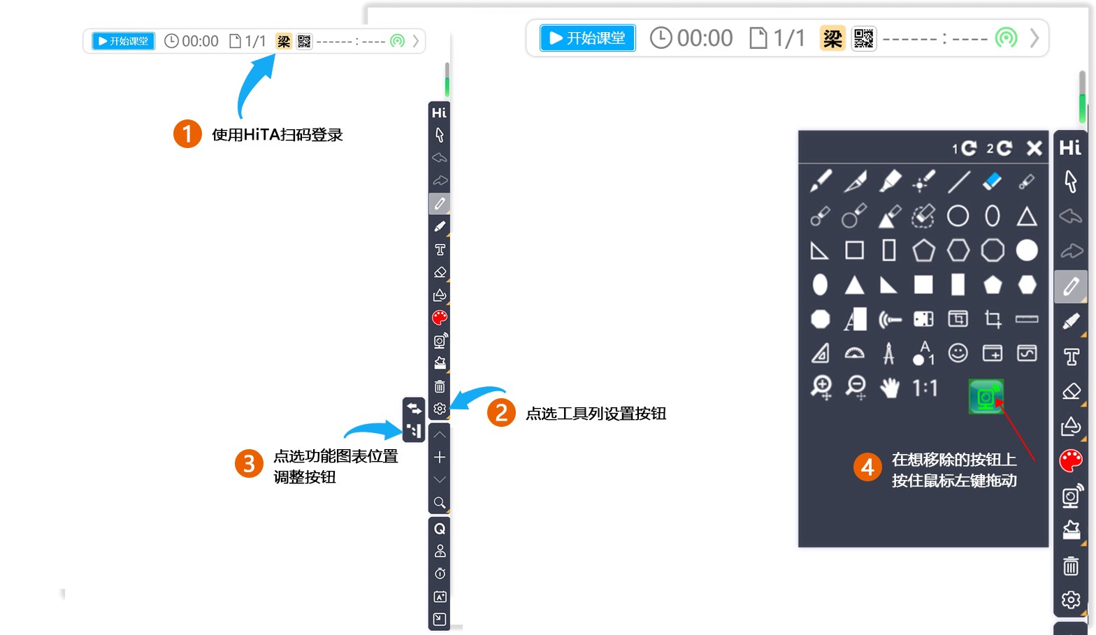 首先,請(qǐng)先用手機(jī)的HiTA掃碼登入HiTeach,若要將自己比較不會(huì)用到的按鈕移除,例如想把實(shí)況攝影機(jī)鈕移除,方法是點(diǎn)選工具列設(shè)定鈕,再點(diǎn)選功能設(shè)定鈕,然后在實(shí)況攝影機(jī)鈕上按住鼠標(biāo)左鍵拖移,即可將按鈕移除。