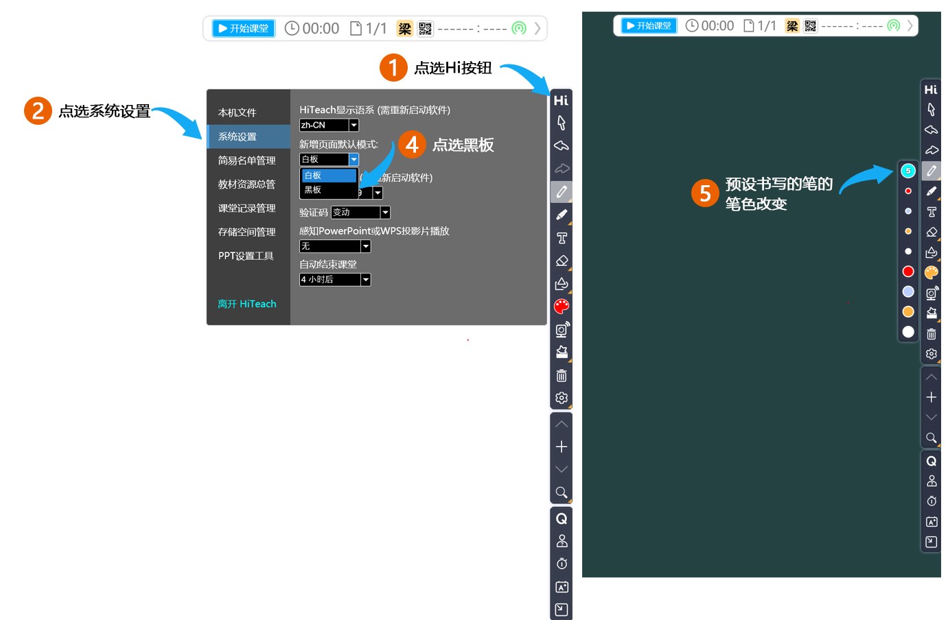 設(shè)定方法是點(diǎn)選主工具列的Hi鈕,接著選擇系統(tǒng)設(shè)定,然后選擇頁面預(yù)設(shè)的模式,點(diǎn)選頁面其它空白位置關(guān)閉設(shè)定畫面后,就完成設(shè)定,預(yù)設(shè)筆色、顏色組合也對(duì)應(yīng)改變。