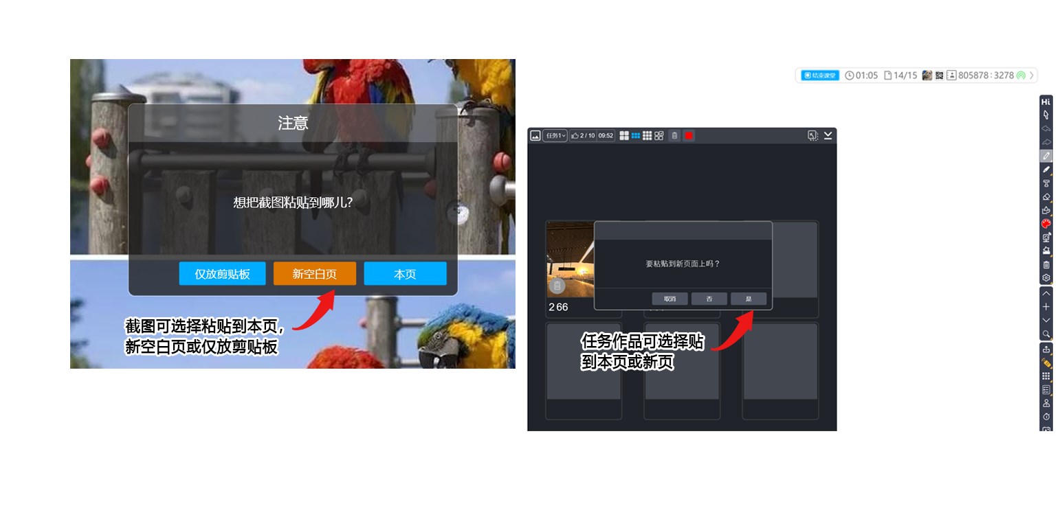 ?使用教具工具的裁剪熒幕截圖鈕進(jìn)行熒幕截圖后,會(huì)先放進(jìn)剪貼簿,然后詢問要將截圖貼在本頁或下個(gè)新頁。