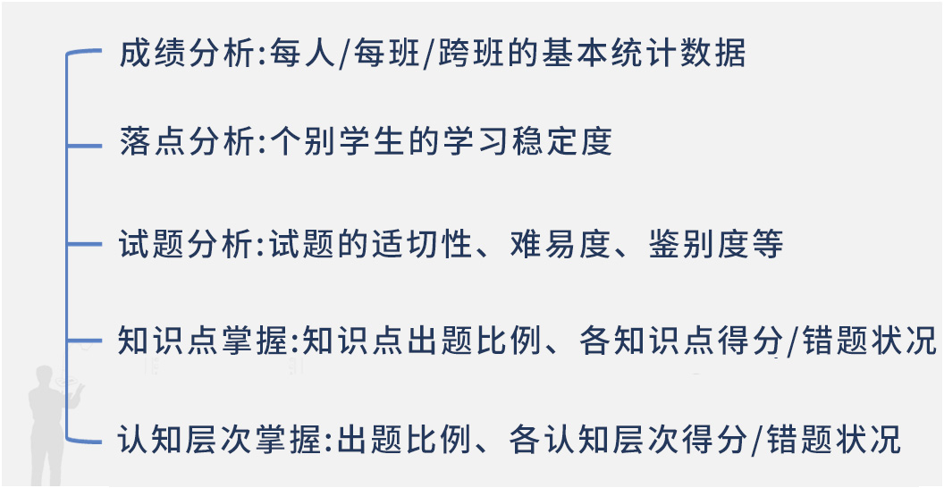 自動產(chǎn)出學(xué)習(xí)評量數(shù)據(jù)之后,經(jīng)由clouDAS診斷分析服務(wù),可以在IES上查看成績分析、學(xué)習(xí)落點分析、知識點掌握和認(rèn)知層次掌握等學(xué)習(xí)分析、試題分析報告,分析班級與個別學(xué)生的學(xué)習(xí)情況。