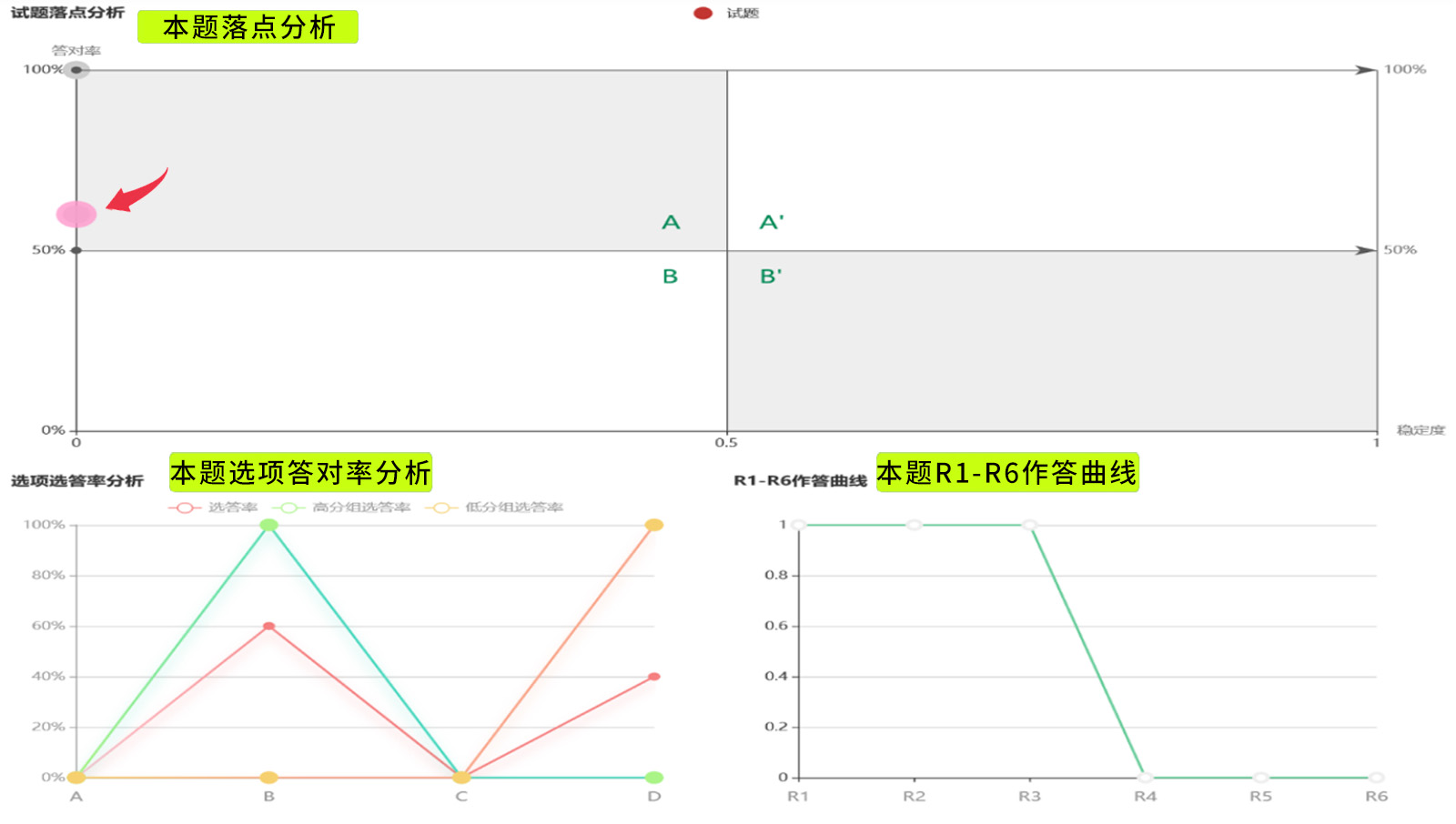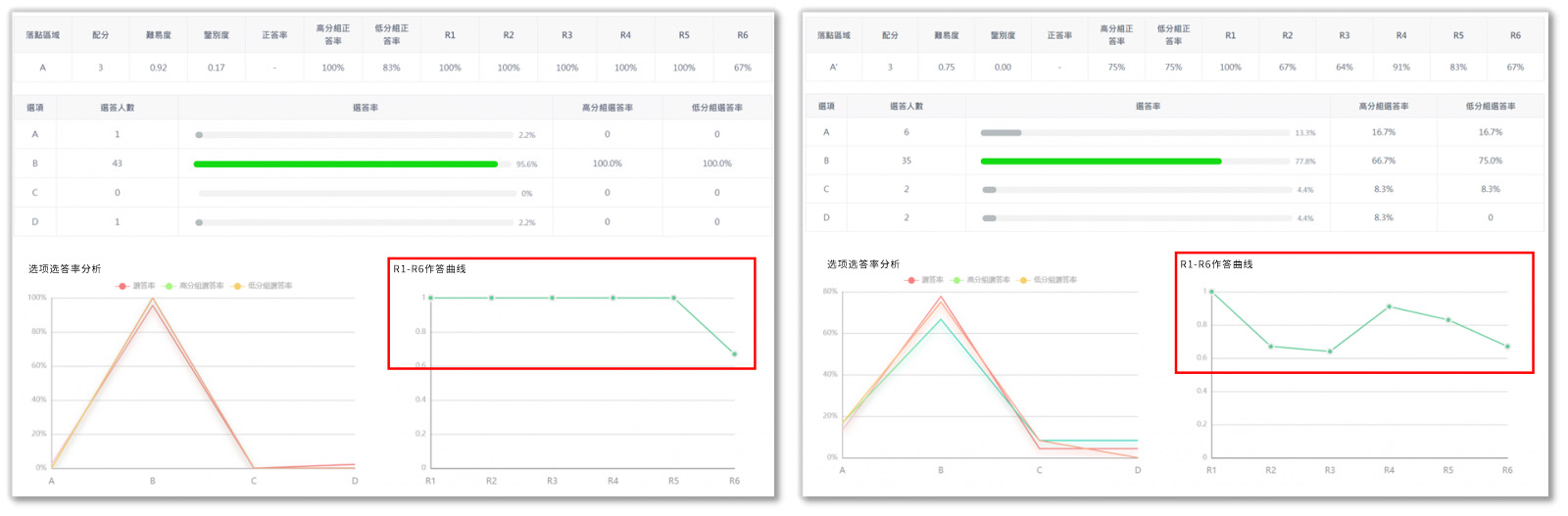 R1-R6作答曲線,可以補充難易度和鑒別度之不足,呈現(xiàn)從高分組至低分組的正答率變化。一個適當(dāng)、鑒別度高的題目,R1-R6的得分率應(yīng)該會越來越低,若R1至R5都得滿分(如下左圖),可能代表試題過于簡單。若R4的得分率遠(yuǎn)高于R3(如下右圖),則可能表示試題需要修正。