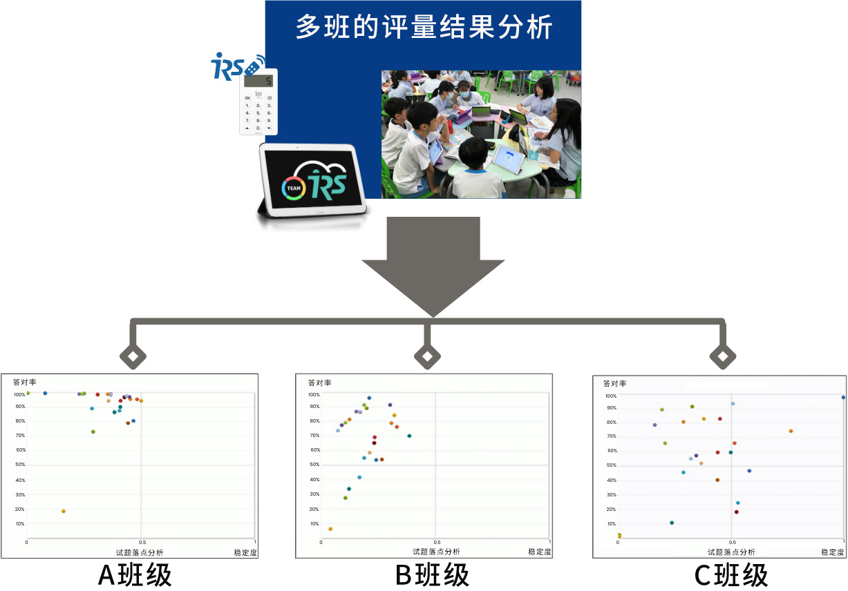透過試題分析報告,可辨識試題的難易與合適度。它可診斷整份試卷中的每一個試題,經(jīng)由測驗后試題質(zhì)量是可測出高成就學(xué)生、可分辨中等成就學(xué)生,或者試題中含有異質(zhì)成分、試題屬于拙劣設(shè)計、無法反映學(xué)生能力等,可藉此報告針對特定試題的設(shè)計與命題技巧做檢視分析。例如,下圖這個多班測驗的范例,同一份試卷,讓不同的班級學(xué)生評量,從結(jié)果試題分析可看見差異,這份試卷對A班來說太簡單、B班剛剛好、C班太難,可以研討對不同班級設(shè)計不同的出題策略,成就每一個孩子。
