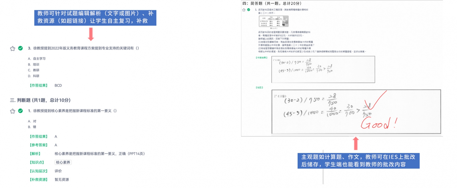 若試卷題目有包含填充、問答等主觀題型,測驗結(jié)束后,老師需要先到IES平臺上進(jìn)行批閱、給分。