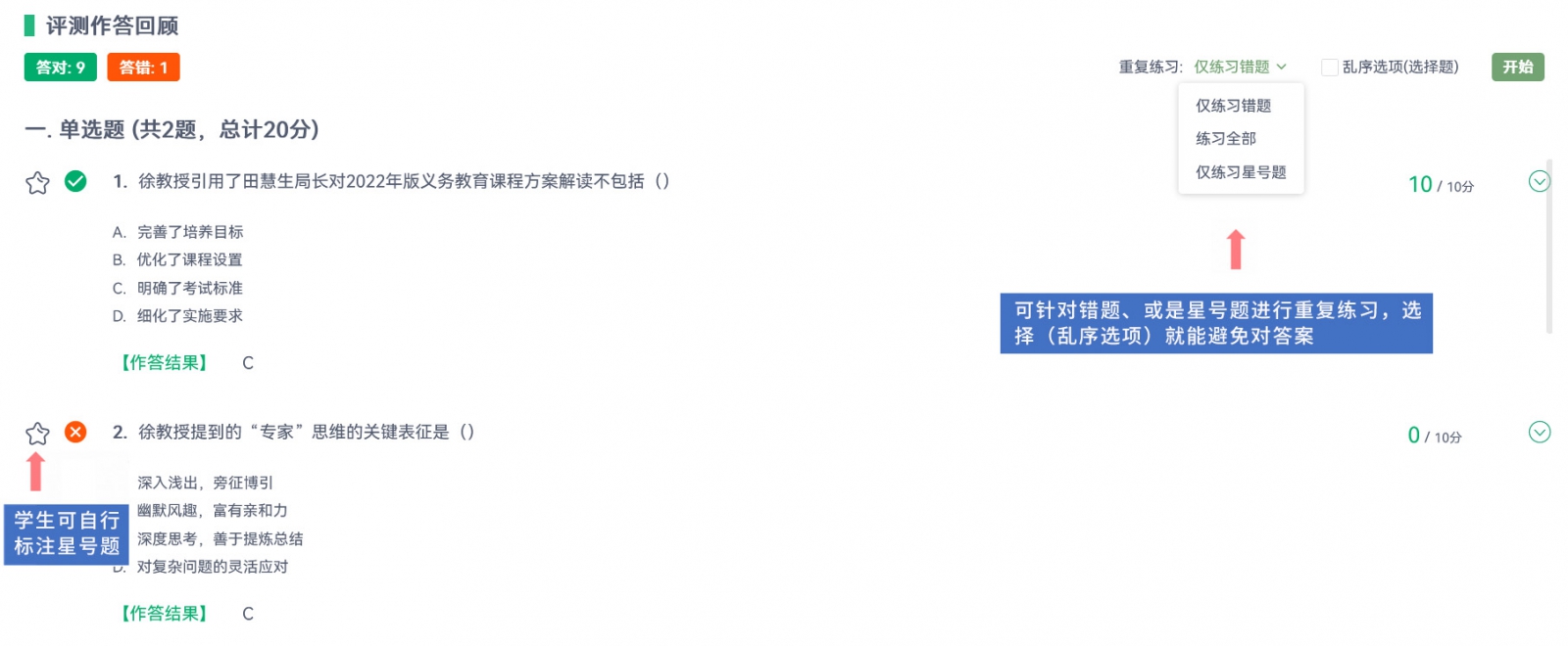 在瀏覽測驗結(jié)果的過程中,學(xué)生可自行為需要加強關(guān)注的題目標(biāo)注星號,后續(xù)可針對錯題、或是星號題進(jìn)行重復(fù)練習(xí),選擇「亂序選項」就能避免背答案!