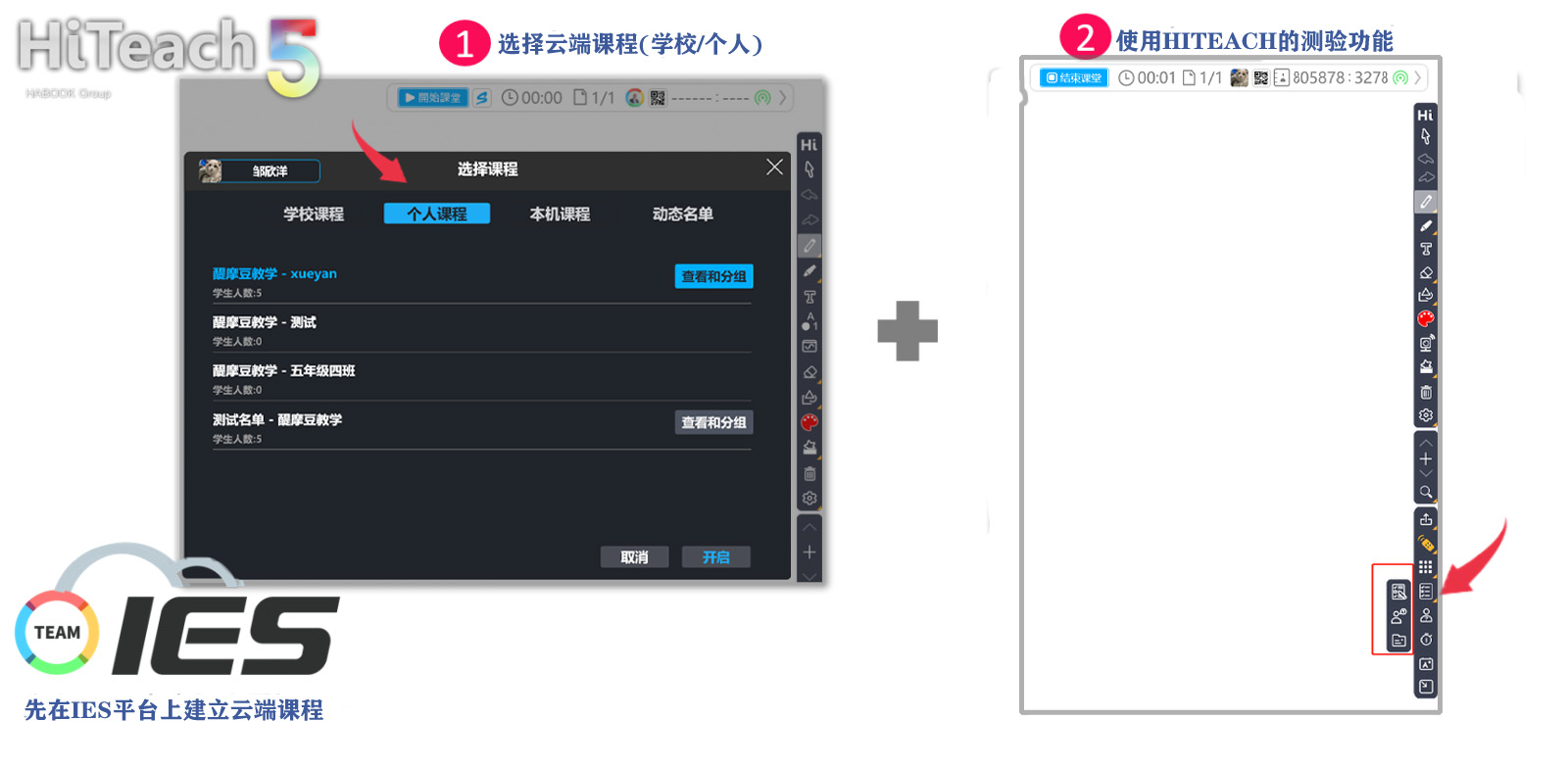 若要進(jìn)行clouDAS診斷分析,在HiTeach中開始課堂時,選擇的課程名單必須是IES云端先建立好的個人課程或?qū)W校管理者所建立的學(xué)校課程,然后啟動HiTeach 5的測驗功能后,測驗結(jié)果就會同步上傳到IES平臺,并進(jìn)行clouDAS診斷分析。