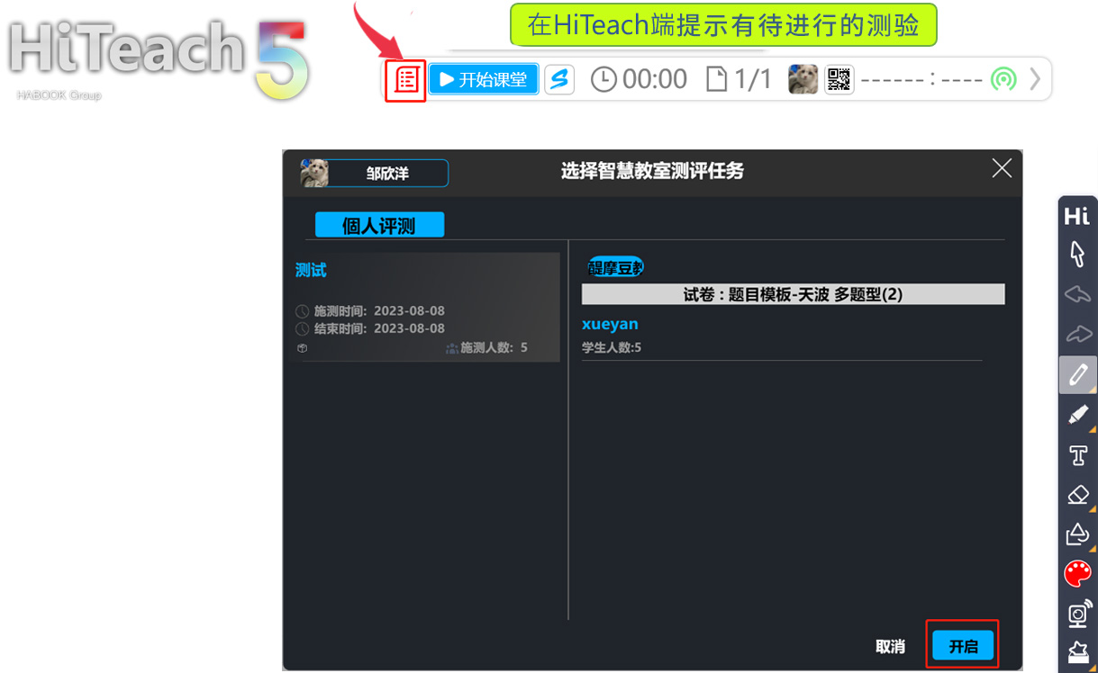 當(dāng)老師在教室里用HiTA掃碼登入HiTeach后,會看到開始課堂鈕旁邊顯示測驗圖示,只要點擊這個圖示,再選擇目前要施測的班級,即可開始進(jìn)行測驗活動。