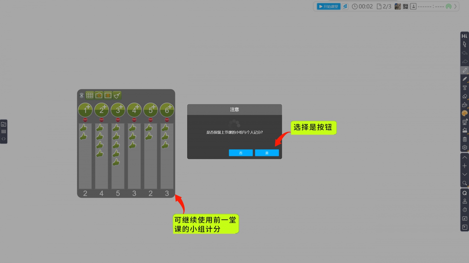 只要未關(guān)閉HiTeach,使用與上節(jié)課相同的課程名單上課,而且記分板有內(nèi)容,就會(huì)詢問(wèn)是否累計(jì),如此,即可記得前一節(jié)課堂的分組計(jì)分,同班上課延續(xù)課堂更方便!