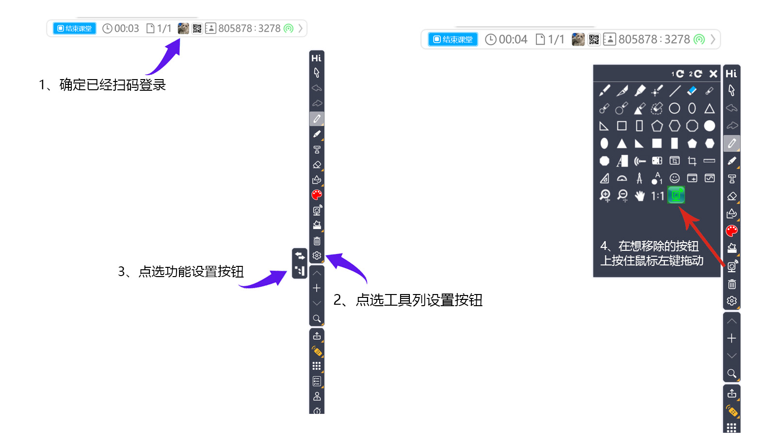 首先,請先用手機的HiTA掃碼登入HiTeach,若要將自己比較不會用到的按鈕移除,例如想把實況攝影機鈕移除,方法是點選工具列設(shè)定鈕,再點選功能設(shè)定鈕,然后在實況攝影機鈕上按住鼠標(biāo)左鍵拖移,即可將按鈕移除。