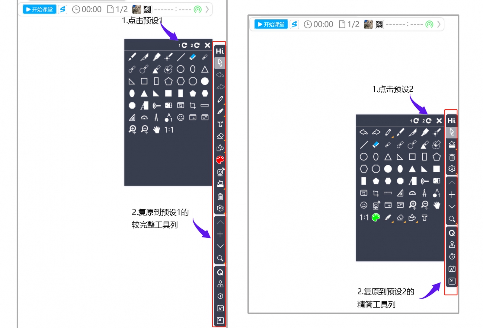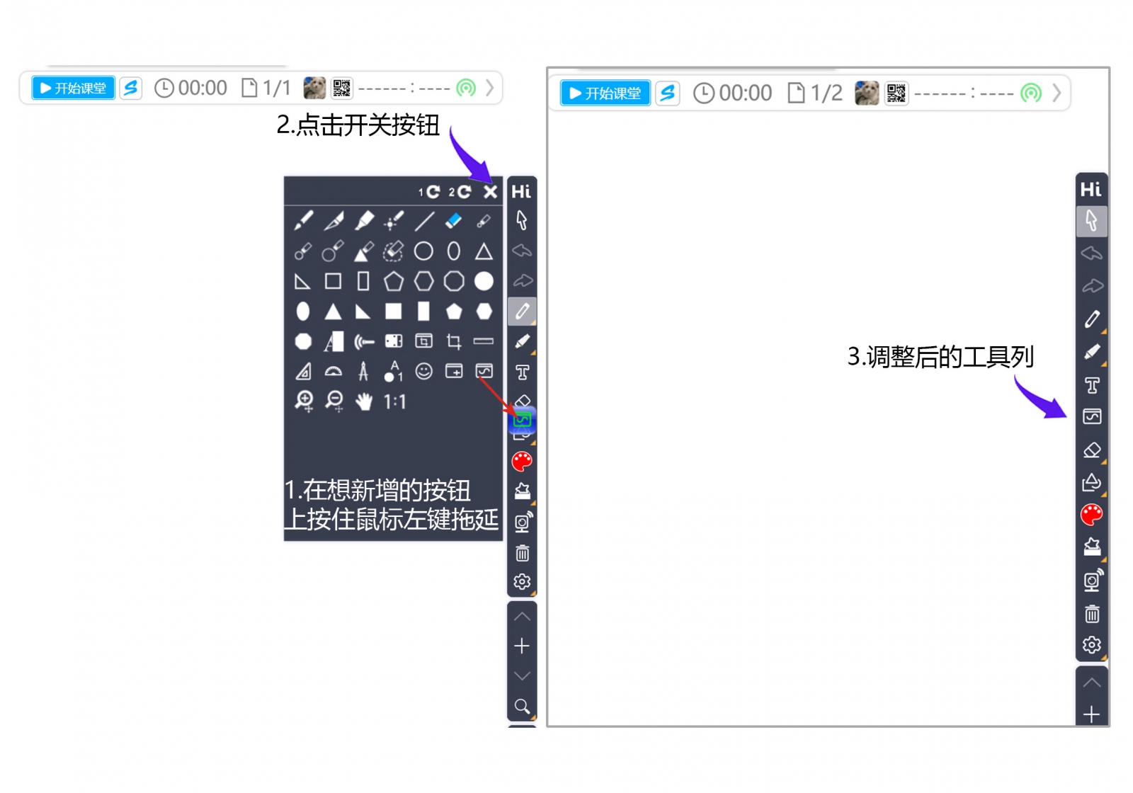 因為HiTeach的使用者非常多元,有老師覺得工具按鈕太多、有的覺得常用的工具希望可以移出來、有的則希望可以直接少一點。因此,盡量讓各種需求的老師可以自己選擇與定義,并且不管在哪臺計算機使用,只要登入帳號使用HiTeach,就可以配合自己習(xí)慣使用的工具列。
