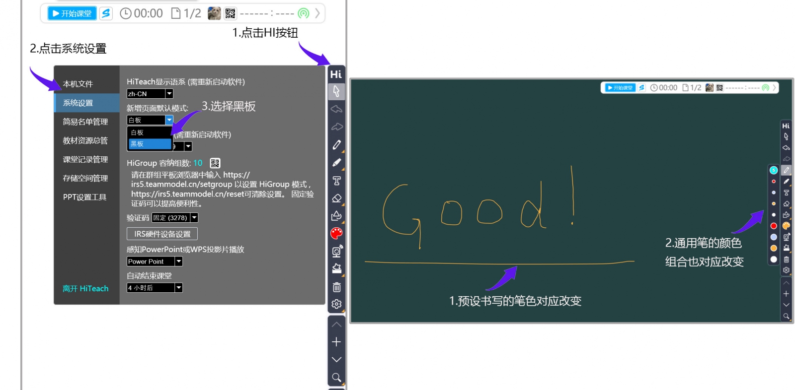設(shè)定方法是點選主工具列的Hi鈕,接著選擇系統(tǒng)設(shè)定,然后選擇頁面預(yù)設(shè)的模式,點選頁面其它空白位置關(guān)閉設(shè)定畫面后,就完成設(shè)定,預(yù)設(shè)筆色、顏色組合也對應(yīng)改變。