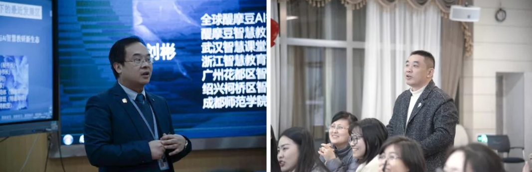 全球醍摩豆AI智慧學(xué)校聯(lián)盟秘書長(zhǎng)劉彬校長(zhǎng)對(duì)本次活動(dòng)進(jìn)行了全程指導(dǎo),展示課結(jié)束后,劉校長(zhǎng)給我們帶來(lái)了《基于數(shù)字化的精準(zhǔn)教學(xué)課例研究與AI智慧教研新生態(tài)》專題講座,劉校長(zhǎng)運(yùn)用智慧教學(xué)的手段,與在座教師頻頻互動(dòng),同時(shí)圍繞三個(gè)問(wèn)題:不忘本來(lái),吸收外來(lái),面向未來(lái)?扁平化的“智慧眾籌”式的教研創(chuàng)生智慧?技術(shù)賦能下的“學(xué)與教”變革思考?向教師們講解了“智慧課堂”和“智慧教研”。 劉彬校長(zhǎng)從三條基本原則、四個(gè)結(jié)合應(yīng)用點(diǎn)、技術(shù)賦能合作學(xué)習(xí)三個(gè)方向著重講解了技術(shù)賦能下的教學(xué)思考,老師們可以通過(guò)二次作答、差異推送、作品分享、智慧助教將信息化工具與合作學(xué)習(xí)緊密聯(lián)系,用技術(shù)為教育教學(xué)服務(wù),提升教學(xué)效果。