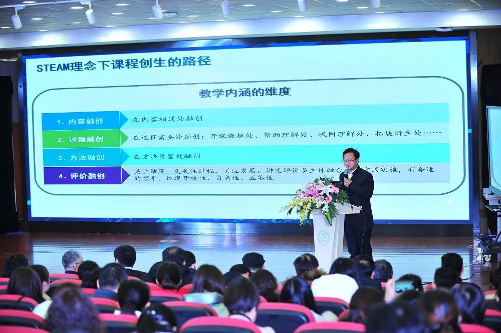 晁志賢副校長(zhǎng)發(fā)言 四川省成都高新區(qū)實(shí)驗(yàn)小學(xué)朱祥烈校長(zhǎng)做了《STEAM教育理念下的教學(xué)創(chuàng)生》專(zhuān)題分享。朱校長(zhǎng)談到了STEM理念下課程創(chuàng)新的四種路徑,即內(nèi)容融創(chuàng)、過(guò)程融創(chuàng)、方法融創(chuàng)和評(píng)價(jià)融創(chuàng)。他還強(qiáng)調(diào),學(xué)校要提升教師STEAM素養(yǎng),引導(dǎo)教師儲(chǔ)備跨學(xué)科教學(xué)的知識(shí)與能力,做一名復(fù)合型教師,提高教學(xué)設(shè)計(jì)與實(shí)施的整合性能力。