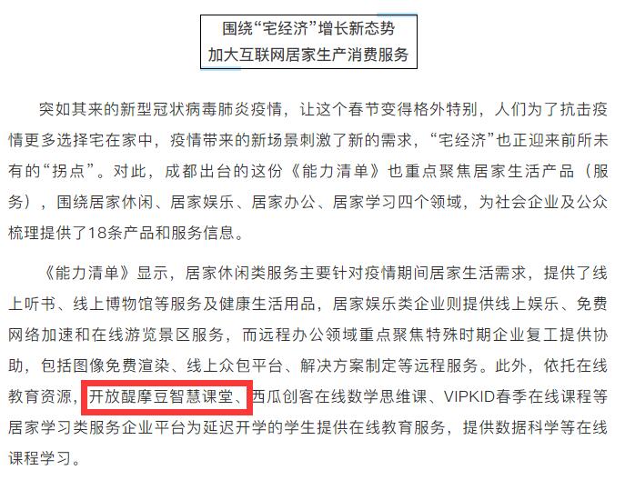 國(guó)家發(fā)展改革委:《成都新經(jīng)濟(jì)企業(yè)疫情防控能力清單》2月5日面向全社會(huì)發(fā)布,共計(jì)各類信息111條,涵蓋物資供應(yīng)、輿情傳播、物流運(yùn)輸、遠(yuǎn)程診療、教育文娛等各個(gè)行業(yè)領(lǐng)域。在圍繞“宅經(jīng)濟(jì)”增長(zhǎng)新態(tài)勢(shì)加大互聯(lián)網(wǎng)居家生產(chǎn)消費(fèi)服務(wù)板塊提到“此外,依托在線教育資源,開(kāi)放醍摩豆智慧課堂等居家學(xué)習(xí)類服務(wù)企業(yè)平臺(tái)為延遲開(kāi)學(xué)的學(xué)生提供在線教育服務(wù),提供數(shù)據(jù)科學(xué)等在線課程學(xué)習(xí)。”