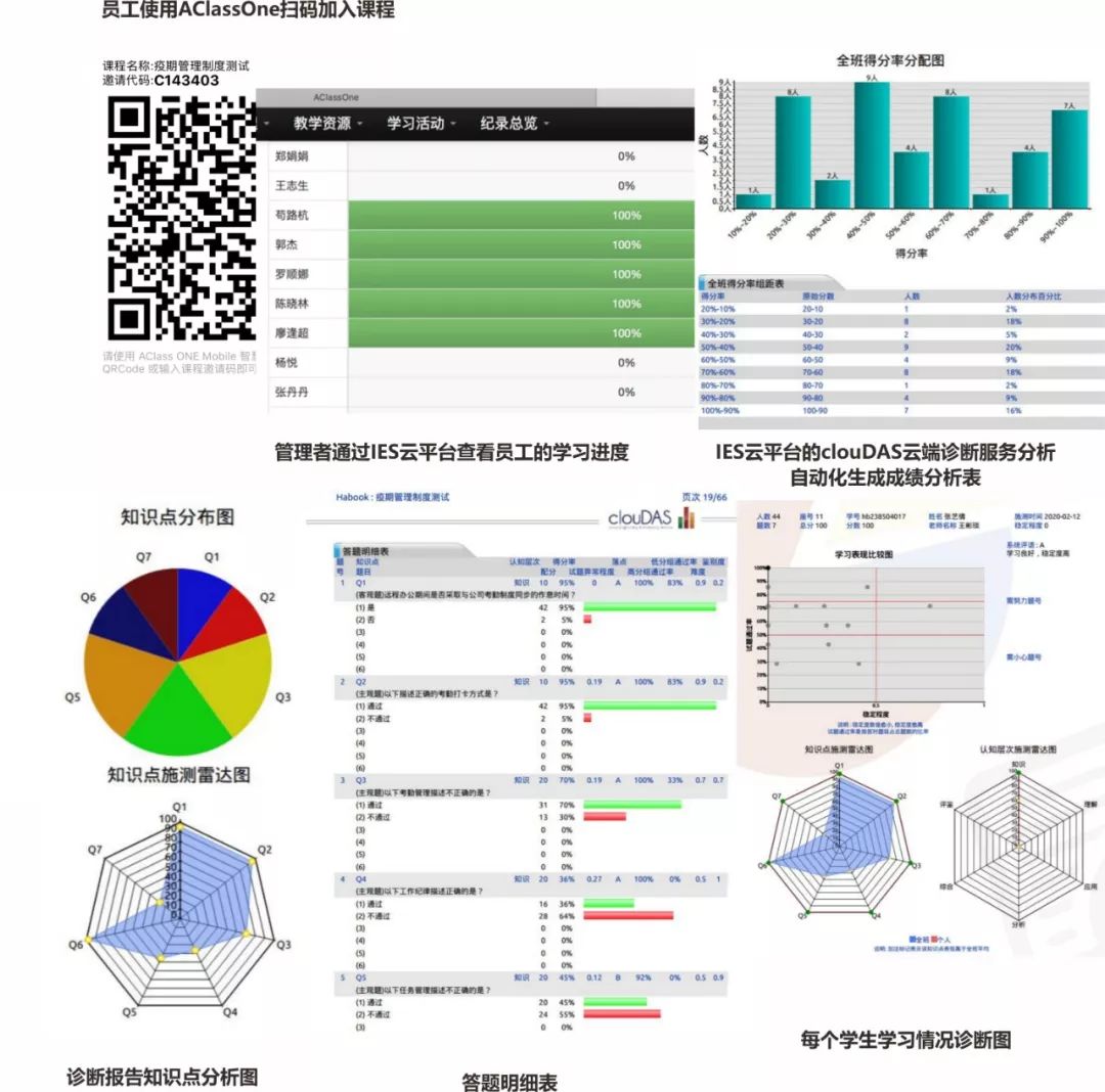 公司員工通過(guò)掃碼加入課程,進(jìn)行制度學(xué)習(xí)和測(cè)試,管理者通過(guò)IES云平臺(tái)查看所有員工的學(xué)習(xí)進(jìn)度,課程結(jié)束后,通過(guò)IES云平臺(tái)的clouDAS云端診斷服務(wù)分析,自動(dòng)化生成成績(jī)分析表,了解員工的學(xué)習(xí)情況和學(xué)習(xí)結(jié)果,將學(xué)習(xí)效果數(shù)據(jù)化呈現(xiàn)。